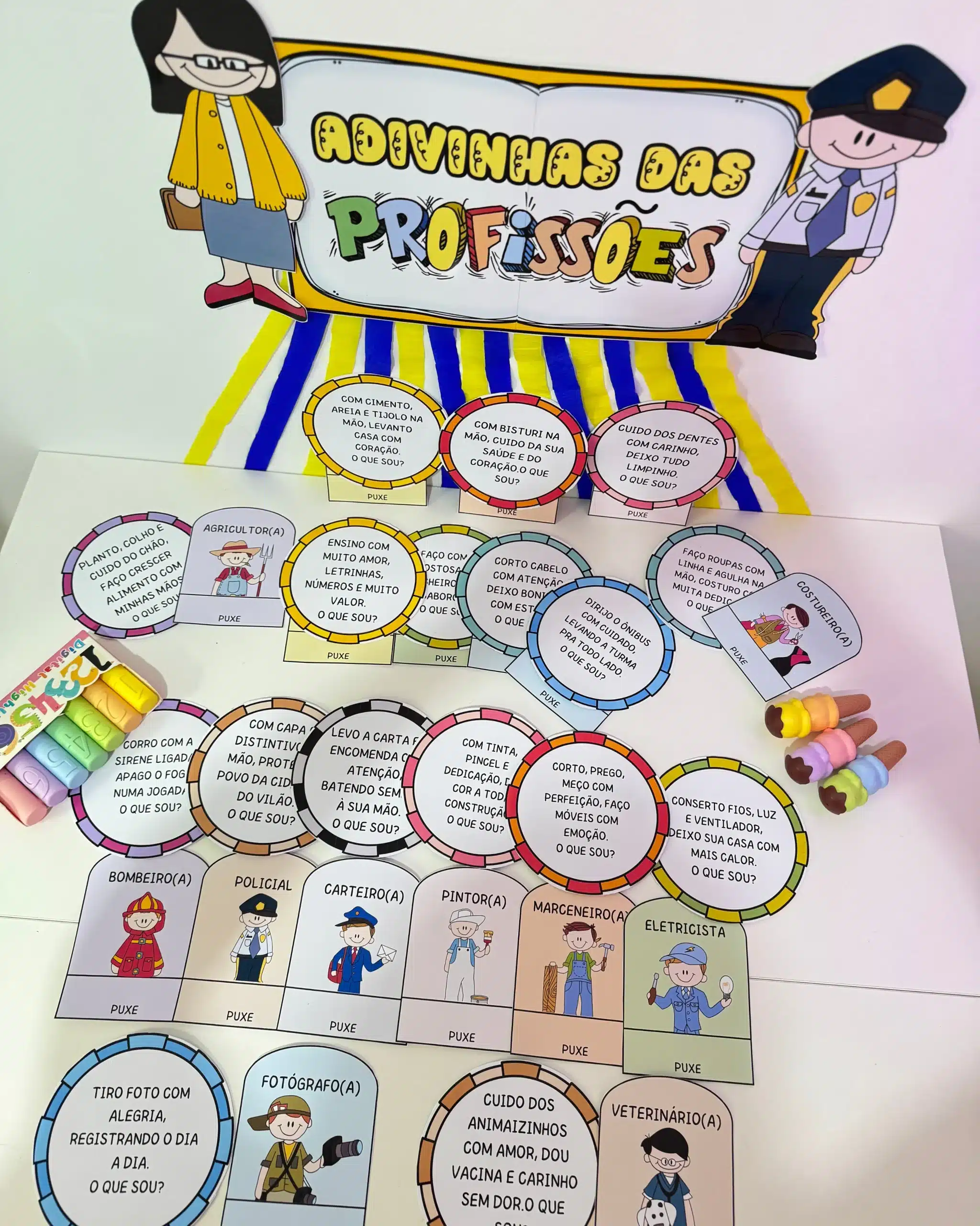 ⭐Arquivo Adivinhas das Profissões para trabalhar o tema com crianças da Educação Infantil e séries iniciais do Ensino Fundamental. ⭐O arquivo vai com 17 adivinhas interativas ilustradas. Para tornar a ficha interativa a parte da pergunta deve funcionar como um envelope. ⭐Para isso cole as laterais da ficha em uma sulfite deixando a parte de baixo aberta, e depois recorte normalmente. ⭐O material vai em PDF pronto para impressão, não editável.