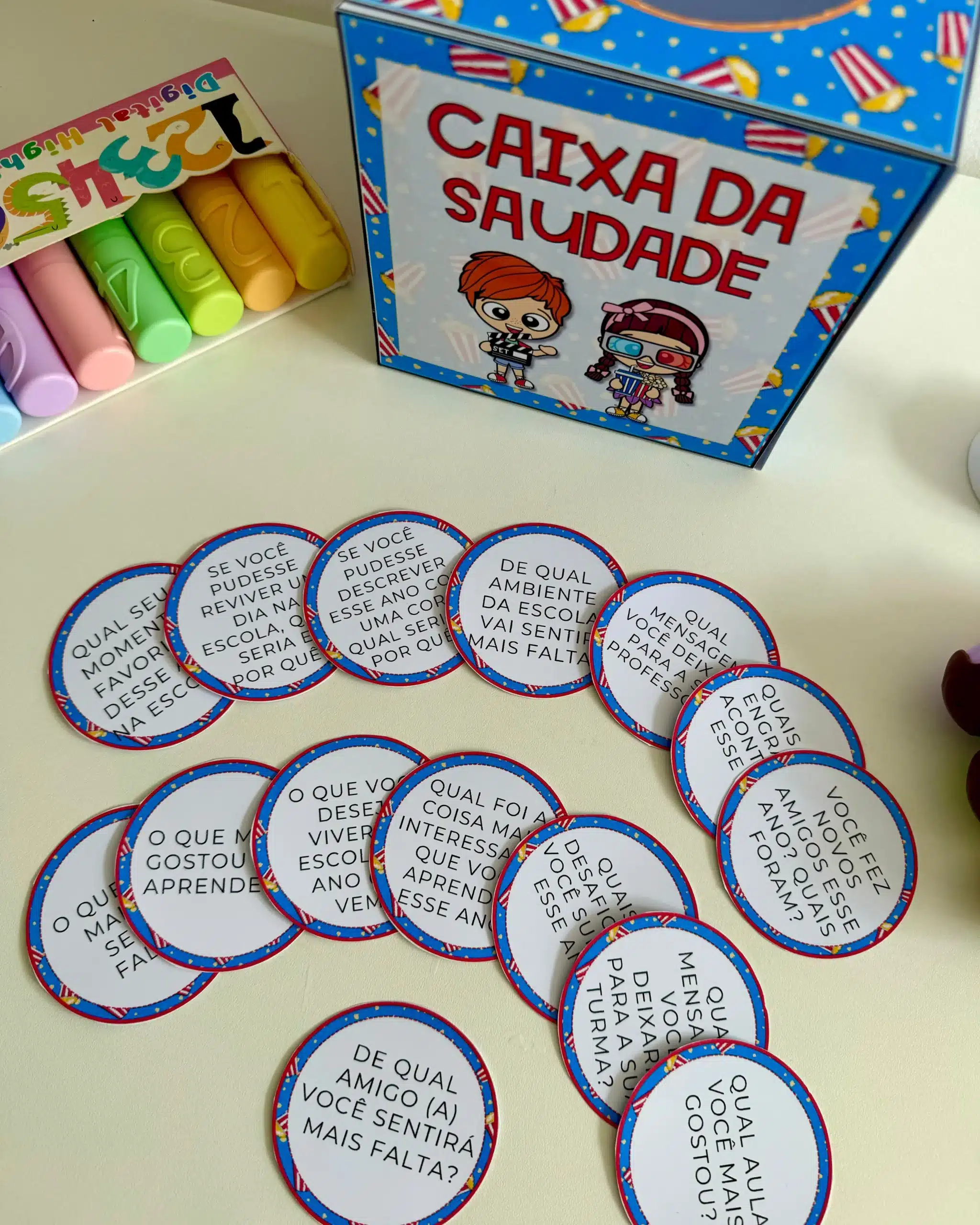Caixa Dinâmica da Saudade para utilizar com turmas de Educação Infantil e séries iniciais do Ensino Fundamental. O material vai em PDF pronto para impressão, e acompanha vídeo tutorial de montagem. No total são 15 fichas com perguntas relacionadas ao ano letivo de 2025 para tornar sua aula repleta de lembranças e recordações importantes. Medidas da caixinha montada: 13,5cm de largura x 13,5cm de comprimento x 13,5cm de altura. O arquivo vai em PDF pronto para impressão.