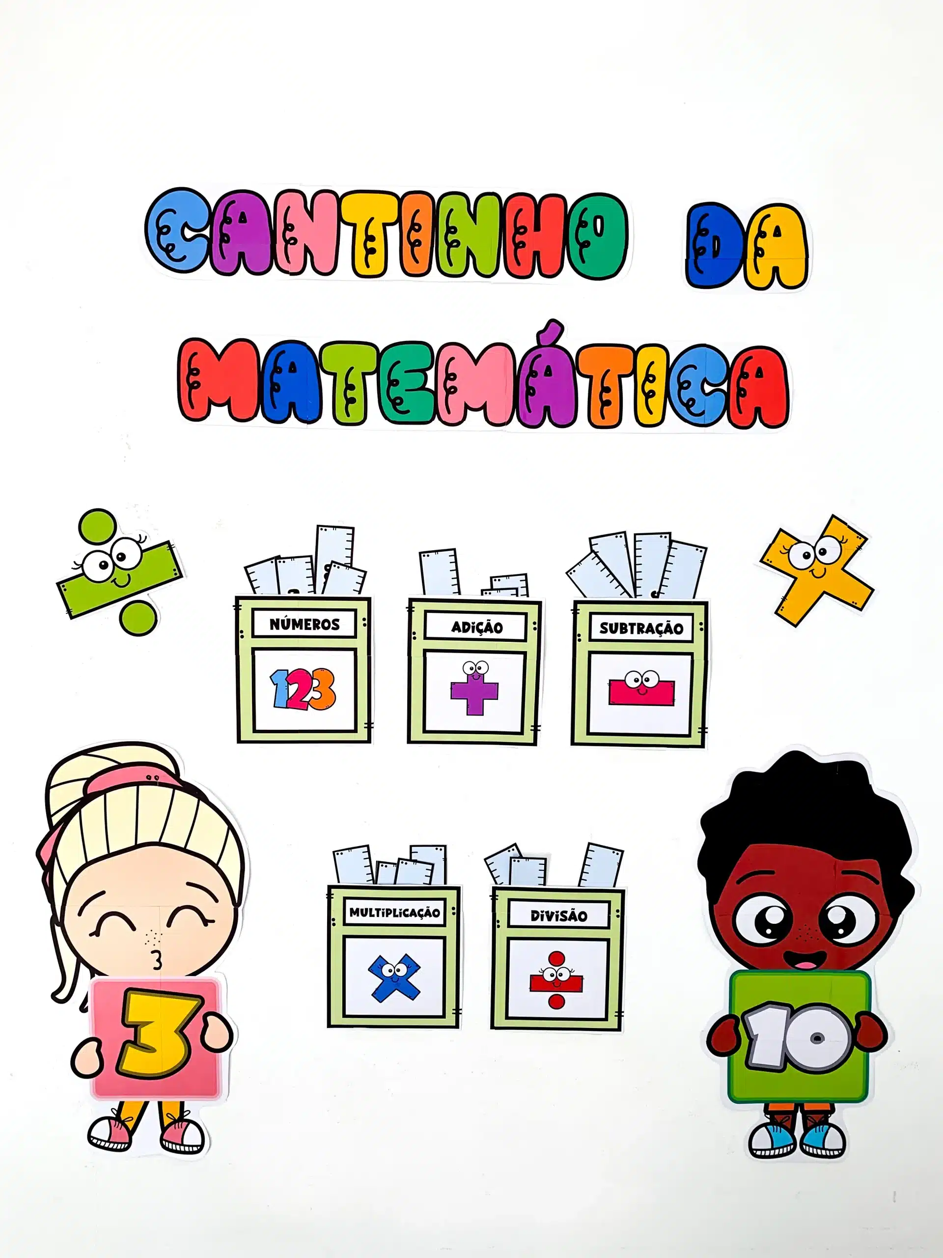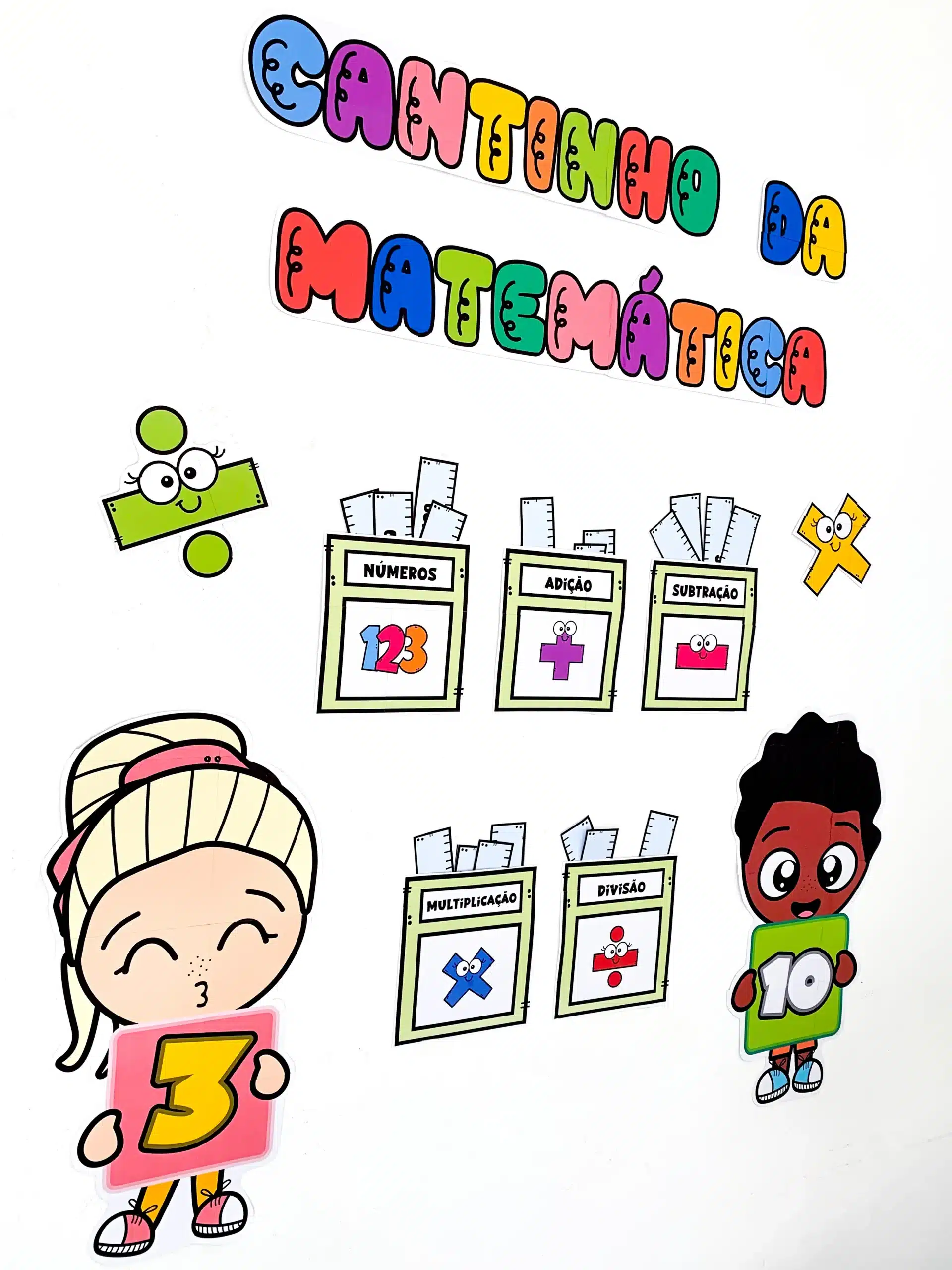 Recurso Cantinho da Matemática para trabalhar o conteúdo com crianças da Educação Infantil e das series iniciais do Ensino Fundamental. Recurso excelente que pode ser utilizado o ano todo com a turma, favorecendo o conhecimento ativo e atrativo. O material vai em PDF pronto para impressão, e inclui os seguintes itens: Painel já ampliado (Aproximadamente 1,5 m de largura e 1,7m de altura montado) Fichas do numerais de 1 a 10 e das dezenas 20 fichas de somas 20 fichas de subtração 20 fichas de divisão 20 fichas de subtração Fichas editáveis