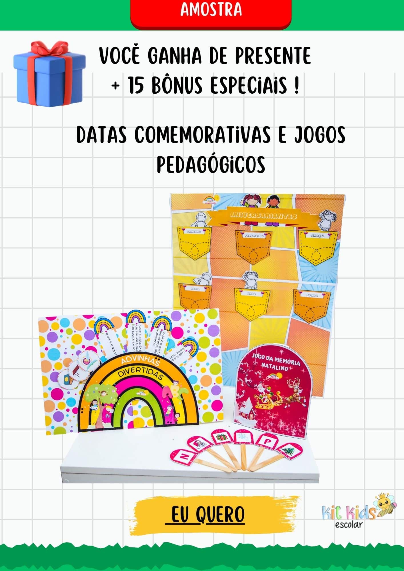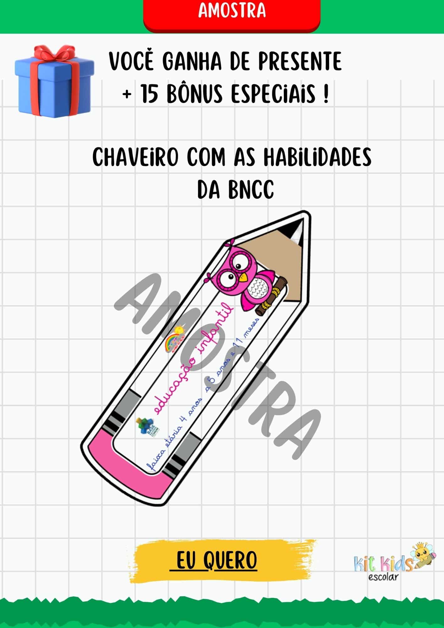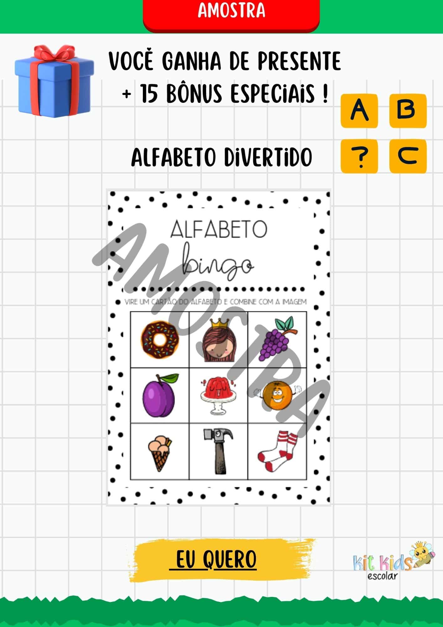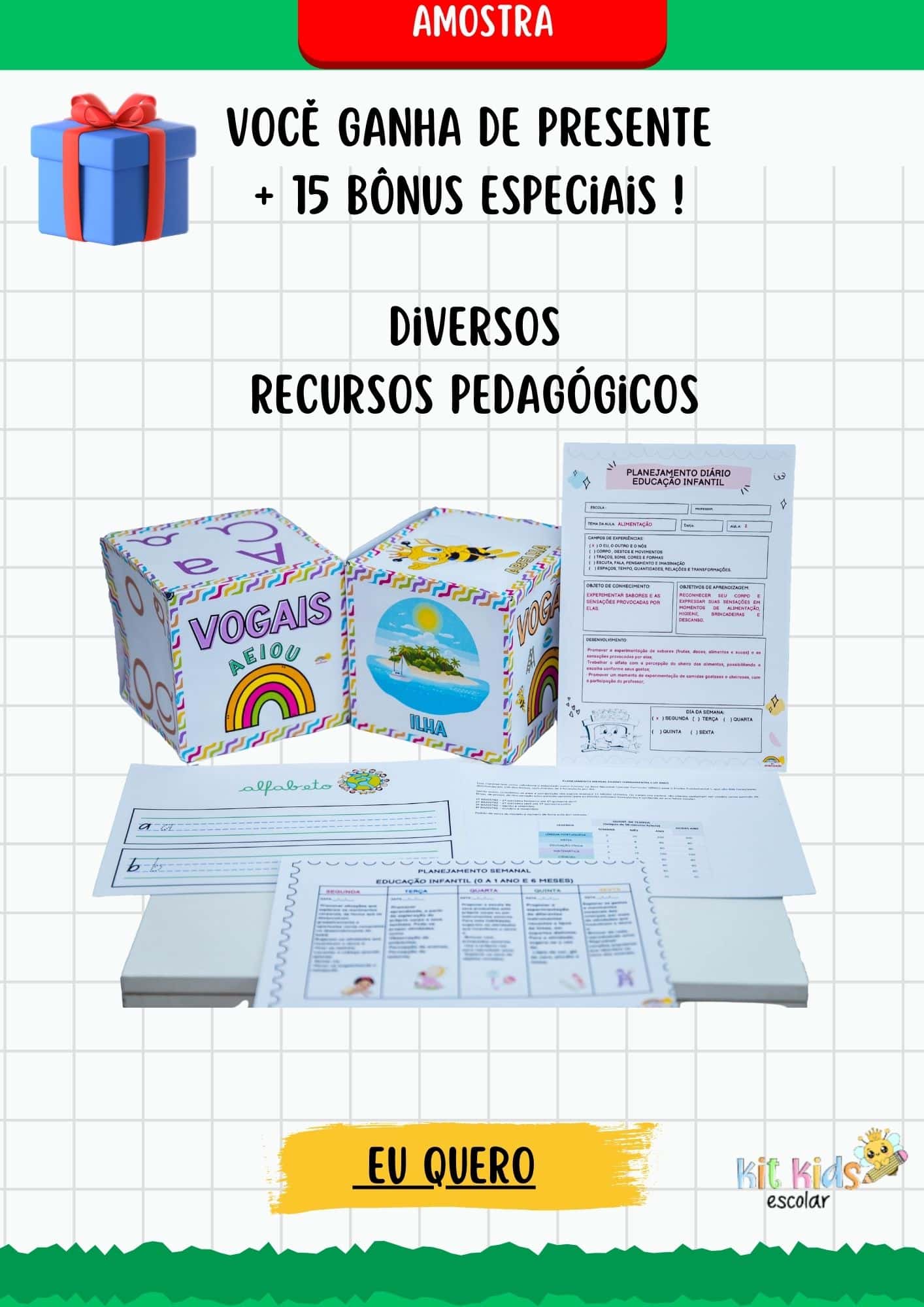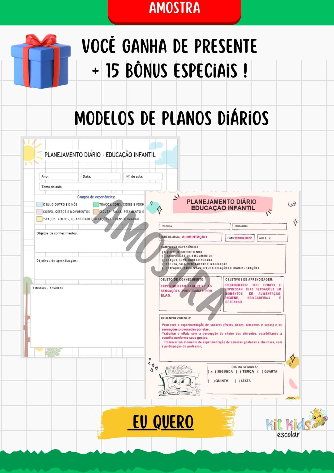 Com 15 bônus inclusos como: Sondagem diagnóstica, sequências didáticas, projetos pedagógicos, alfabeto e números mágicos, brincadeiras, dinâmicas e muito mais.