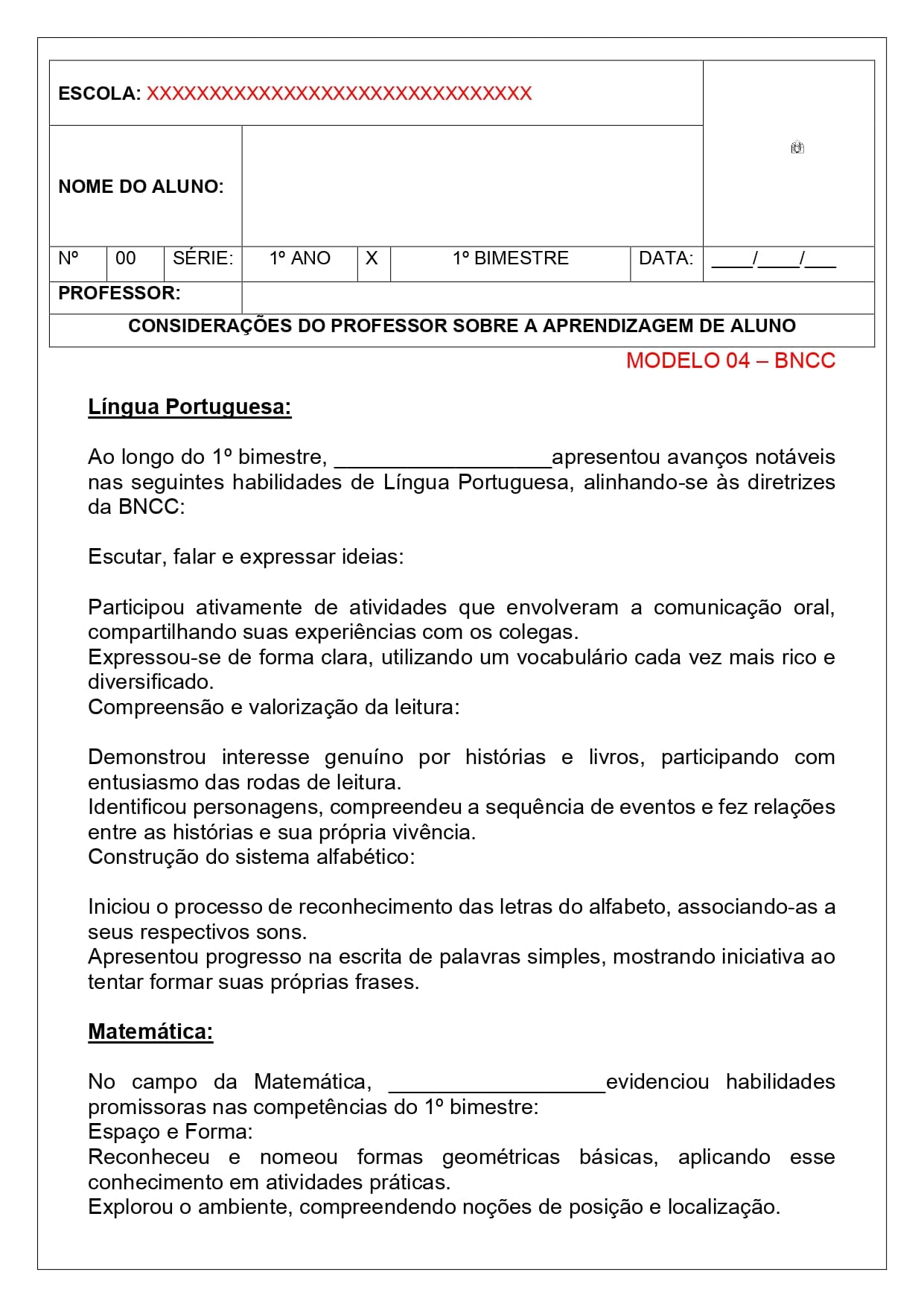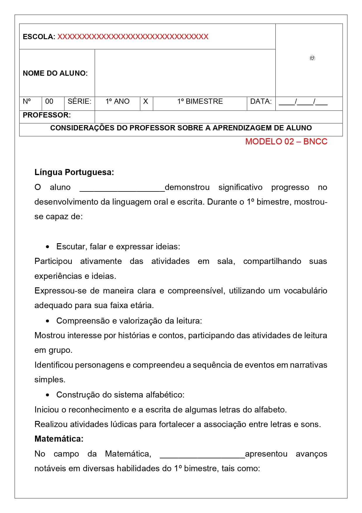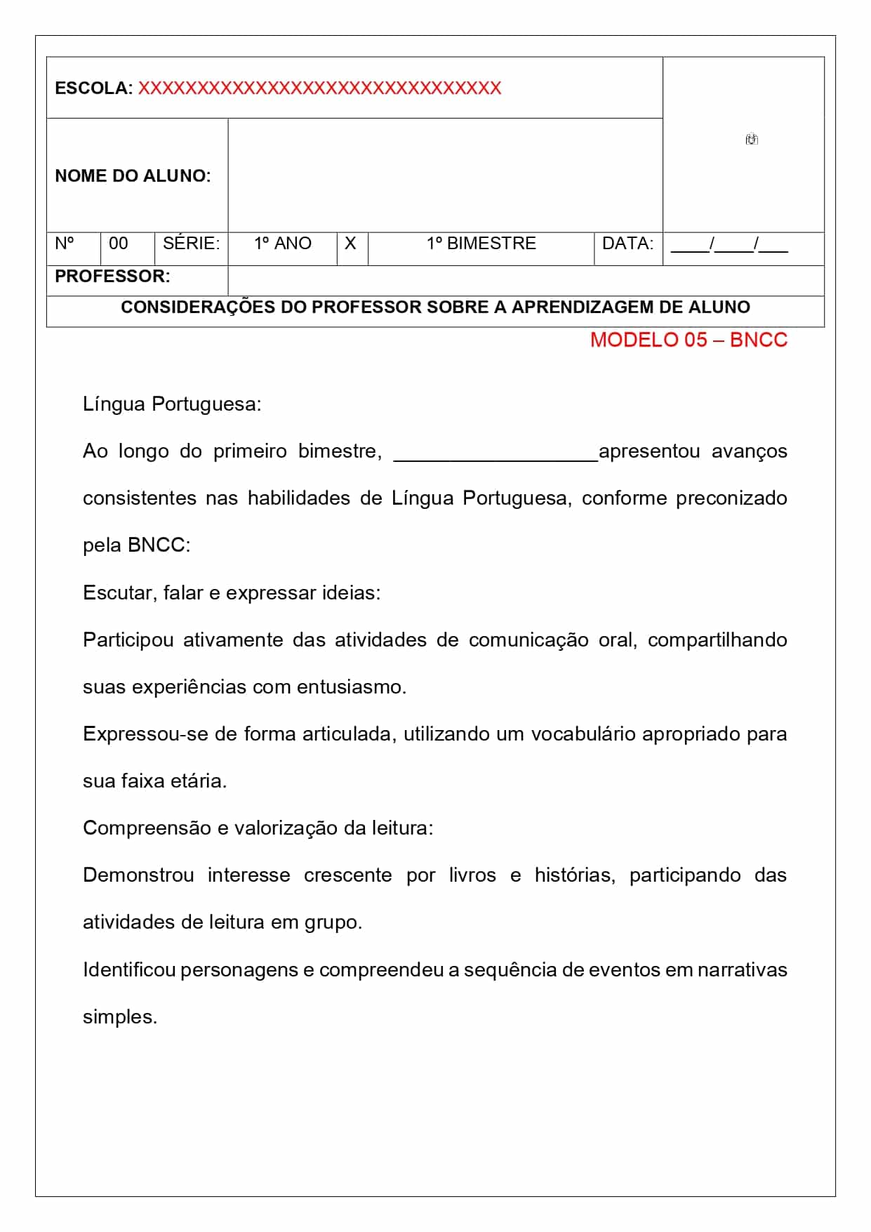 modelos de relatórios descritivos individuais ( bncc, alfabetização entre outros)