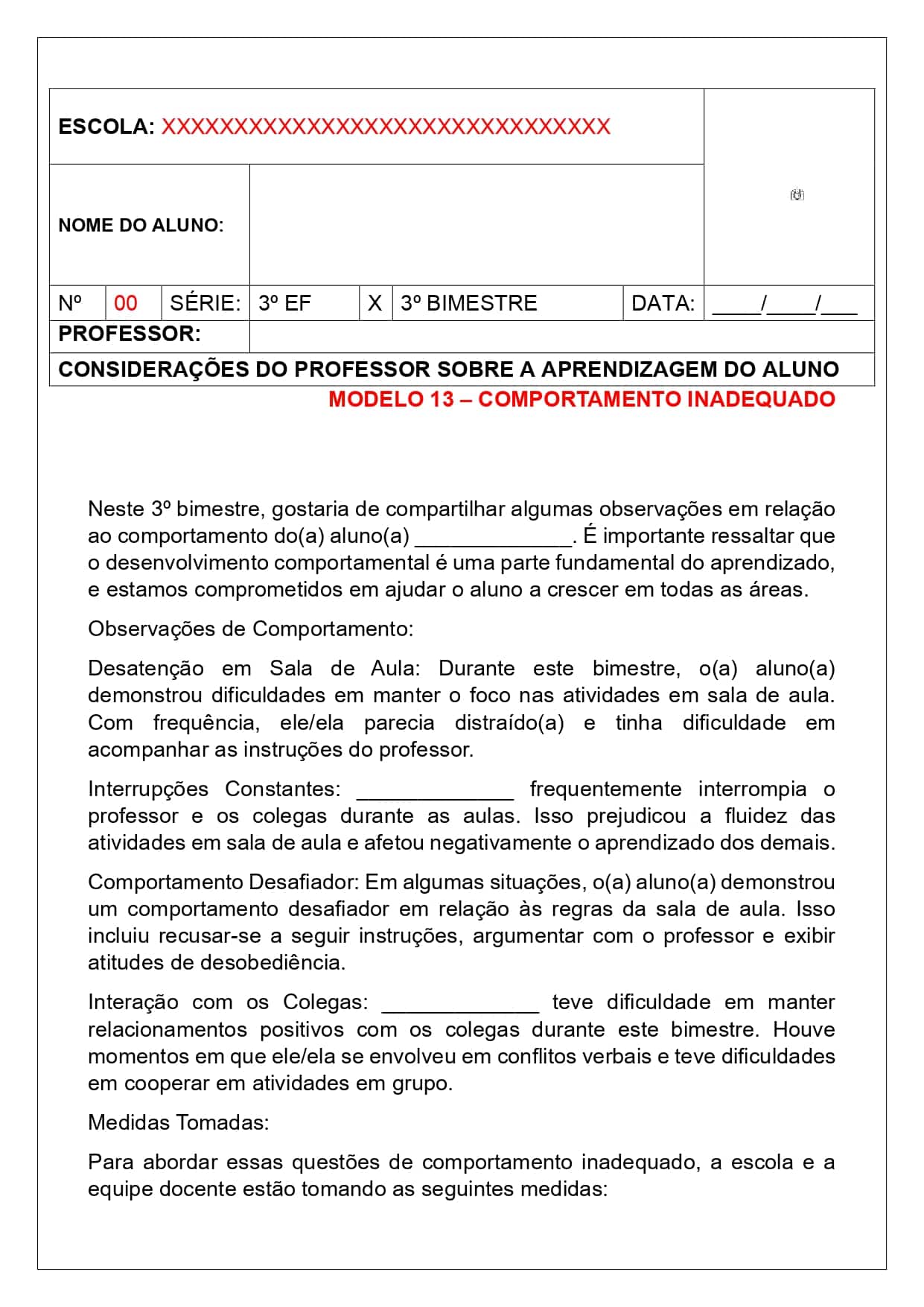 relatório para sala regular e educação especial ( incluindo encaminhamento médico)