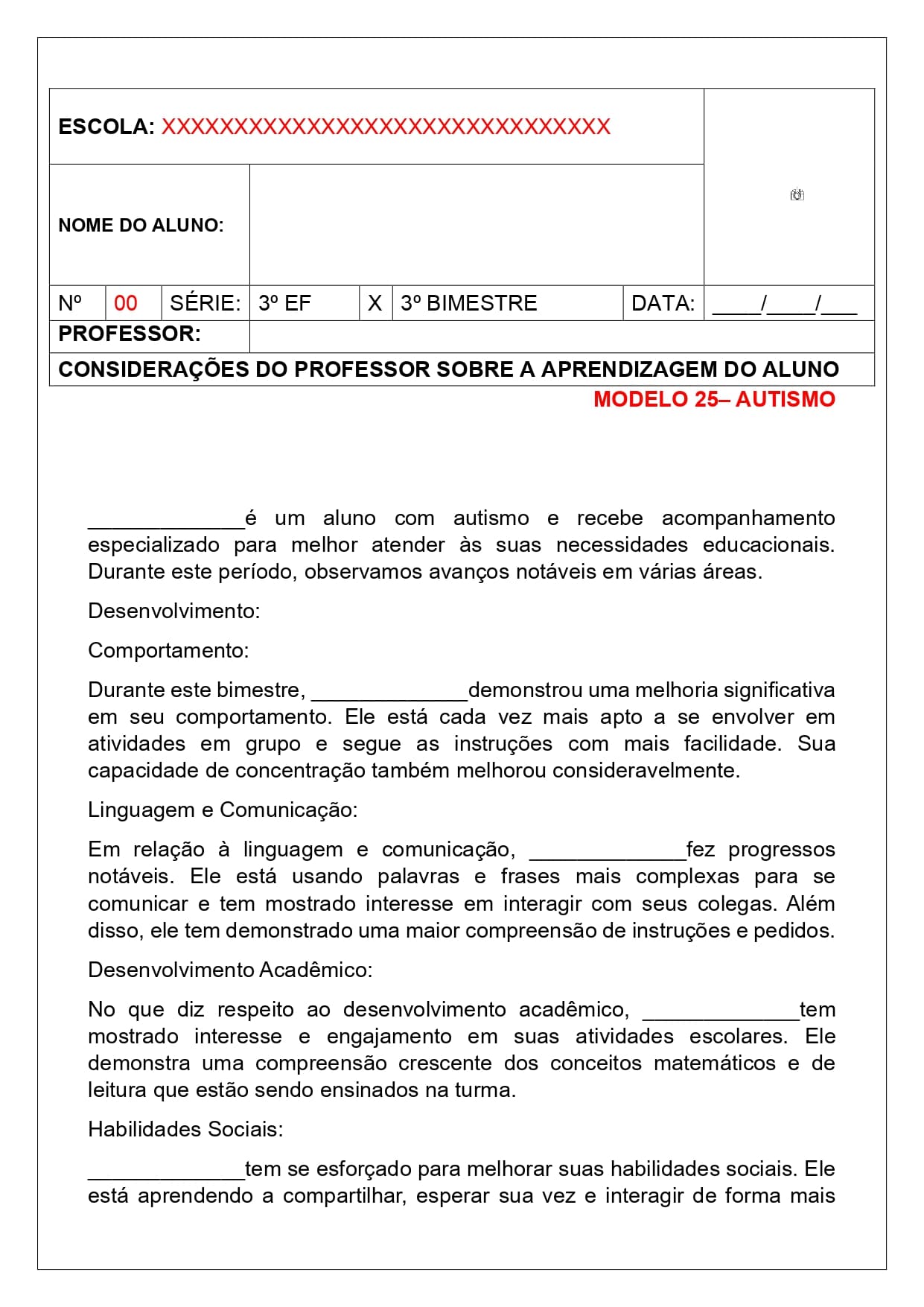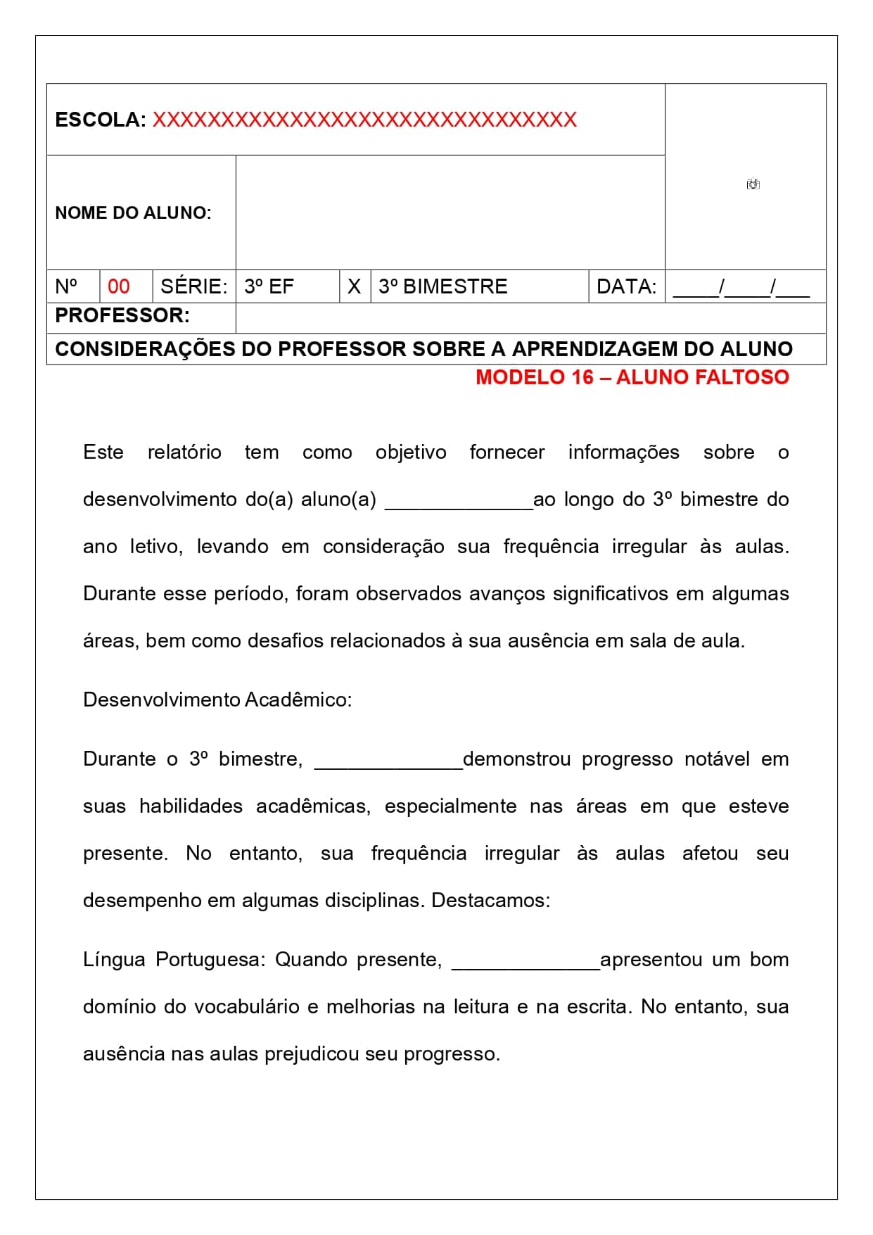 31 modelos de relatórios descritivos individuais e de turma.